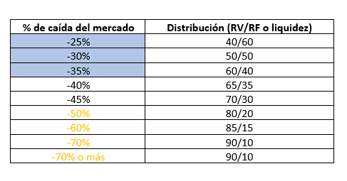 Dicha tabla básicamente nos viene a indicar que conforme vayamos viendo las caídas desde máximos así deberíamos situar como MÍNIMO nuestra distribución patrimonial de riesgo/no riesgo.